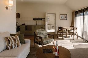 Inside is a bedroom with a king bed, a well-appointed kitchen complete with a fridge and gas hob, and there’s also a barbecue outside. A spacious lounge