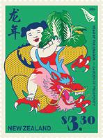 The stamps for this year were designed by Ying-Min Chu. They were inspired by a variety of Chinese New Zealand stories: Eden noodles on Dominion Road, the Ah Chee market gardeners, the 1865 gold rush in Otago and Thomas Dong Woo’s firework business. They display a colourful array of chubby, cherub-like figures. Depictions of Chinese dragons mingle with Māori designs, intertwining the Chinese and Kiwi cultures.