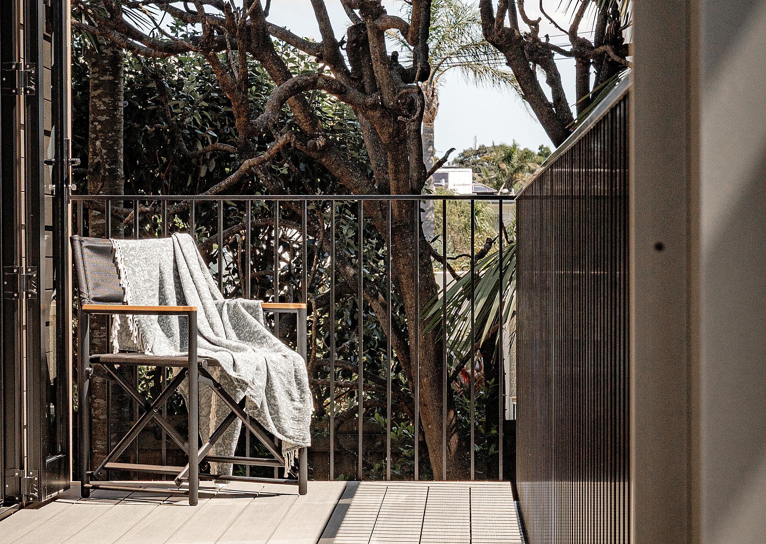 • Morning terrace with Louvretec roof, overlooks Milford Beach.