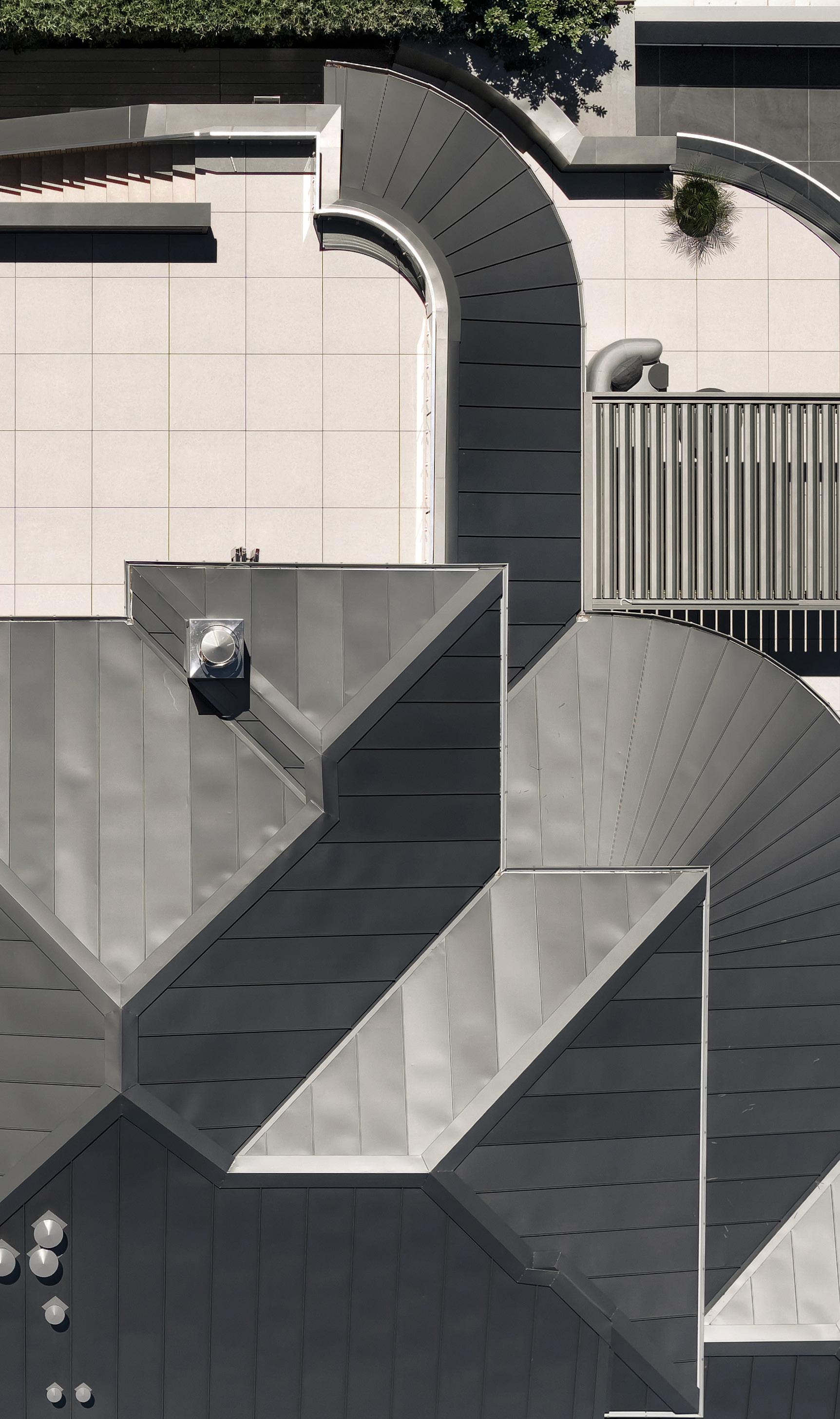 • Custom-designed colour-coated AlumiGard Aluminium roof - architecturally detailed to be splayed to the curved area of the roof. With powder-coated curved aluminium flashings and cappings. Stainless steel brackets.