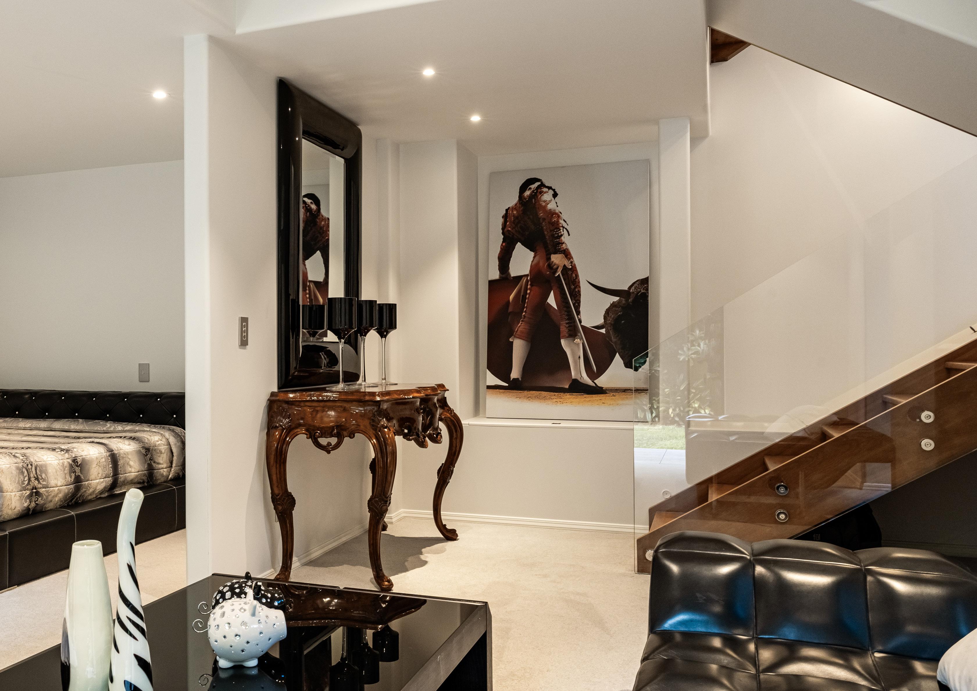 Inside, the home is nothing short of breathtaking. A dramatic three-level kauri staircase forms the heart of the interior. This is illuminated by the featured glass artwork, specifically designed in the style of Piet Mondrian.