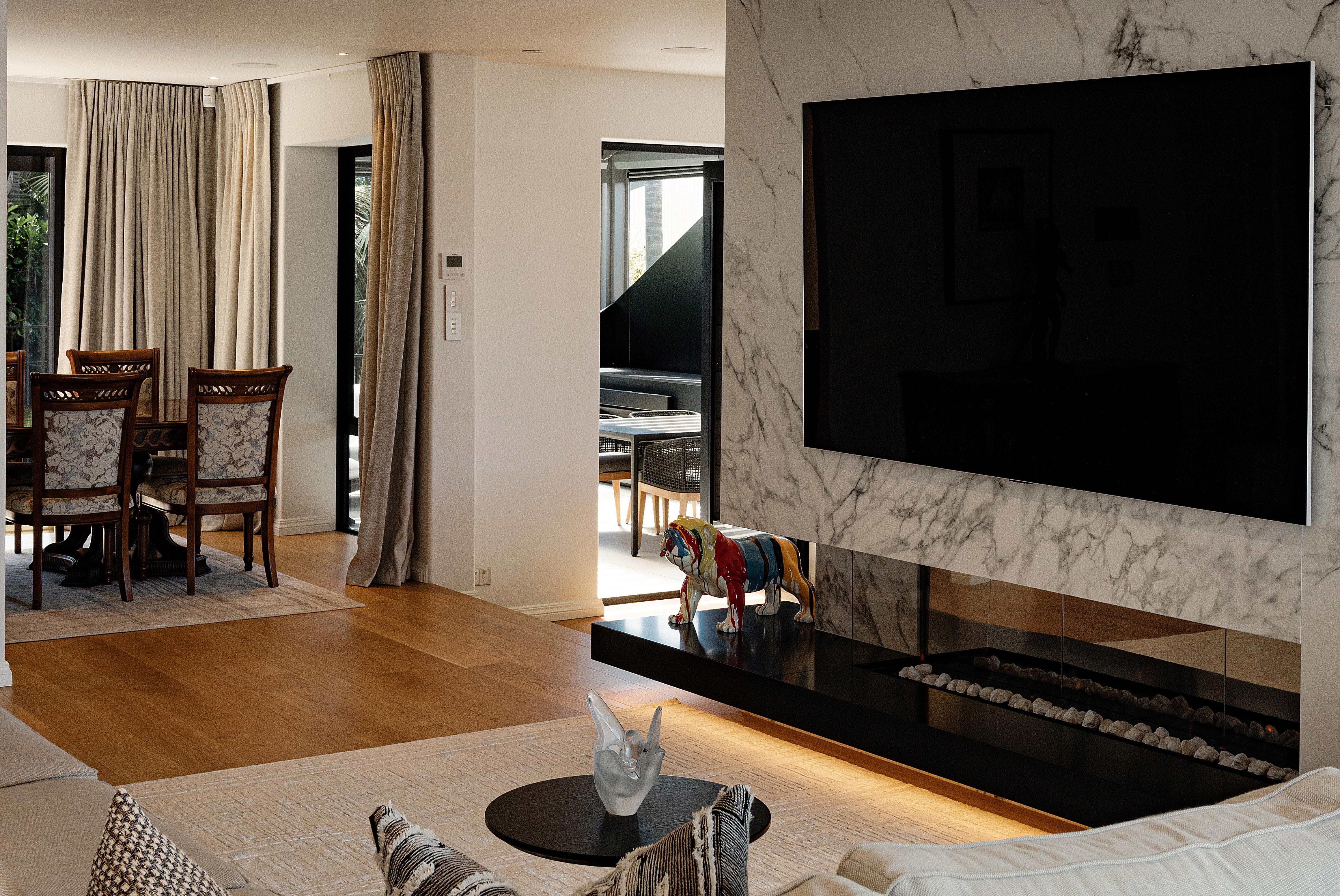Outdoor living has been curated for all-day enjoyment. A sun-soaked morning terrace captures views across Milford Beach, while the expansive afternoon entertaining deck is designed for year-round use. Featuring an automated Louvretec roof with outdoor heaters, weather curtains, integrated lighting, and surround sound, this space also boasts a striking custom blackened-aluminium outdoor kitchen with flueless gas fireplace, sink, beerfridge, and granite benchtop—perfect for hosting in complete privacy and comfort.