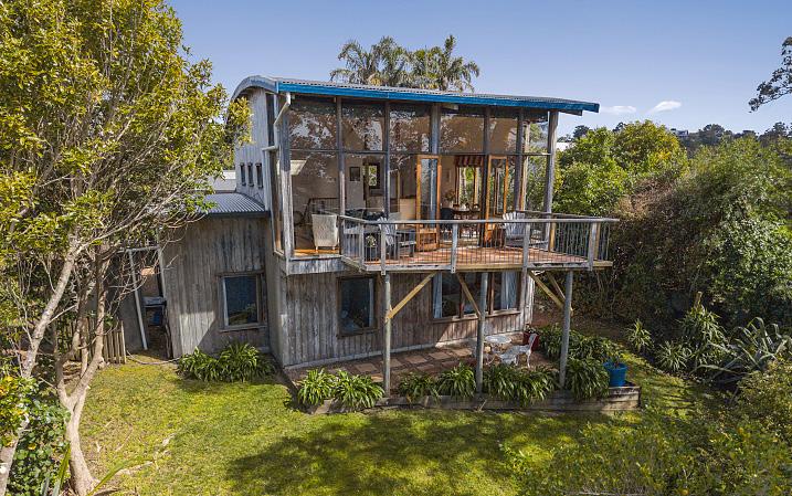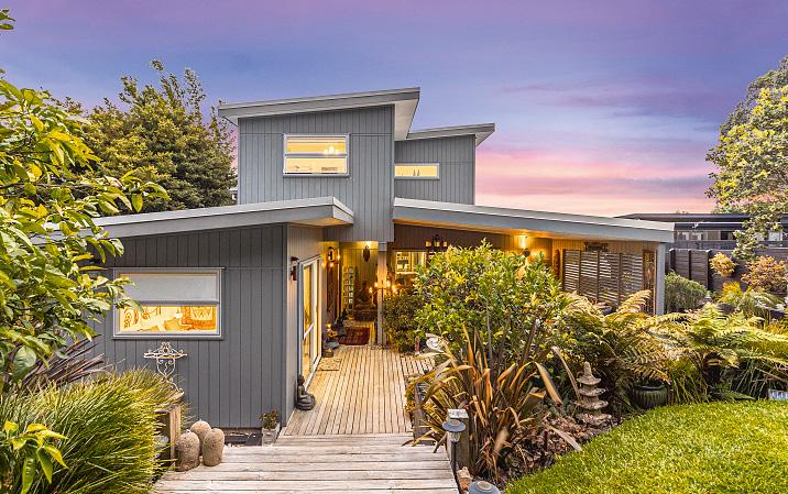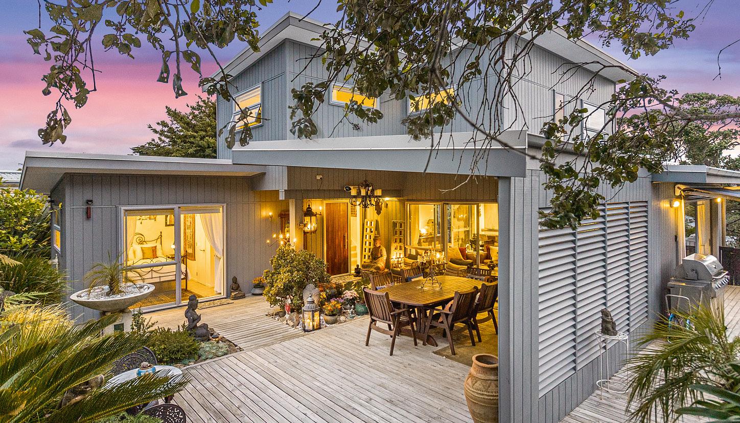 This substantial three bedroom home with internal-access garage plus massive, separate studio enjoys glorious views over Wawata Estate and the Hauraki Gulf to the imposing Coromandel peninsula. The haven-like setting features gated, fully fenced grounds with parking for the boat and cars. The main floor boasts impressively high ceilings and floor-to-ceiling windows plus two decks while, down below, there are three bedrooms, a stylish contemporary bathroom and large laundry. Originally a working artist’s escape, the enormous gallery-style studio is graced with towering windows, with a separate bedroom/study space to the rear. Potential to apply for consent to allow the addition of a bathroom and facilities would make this the perfect visitor facility. Just a 500m stroll to the shore for summer swims, it’s near all the Palm Beach amenities.