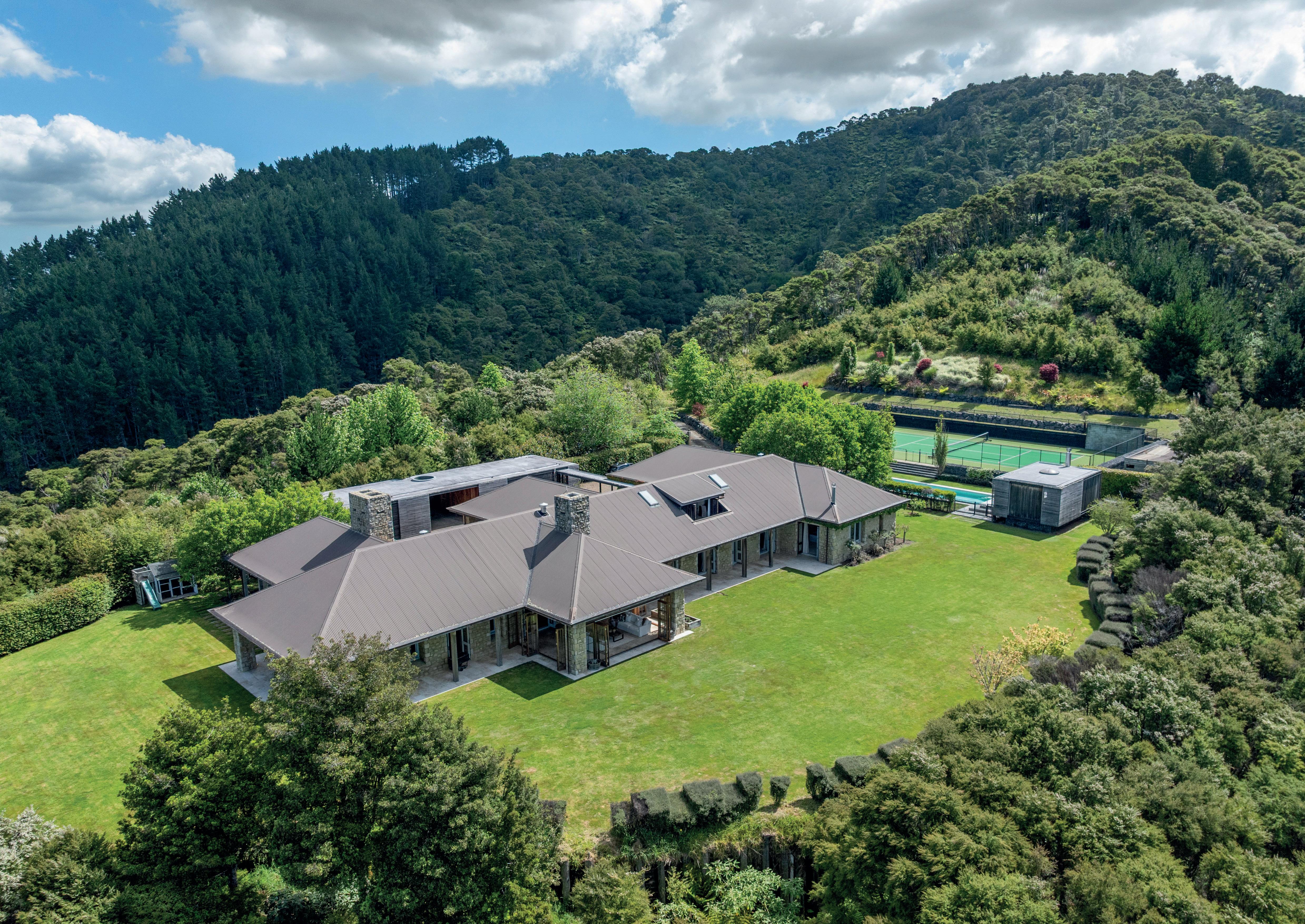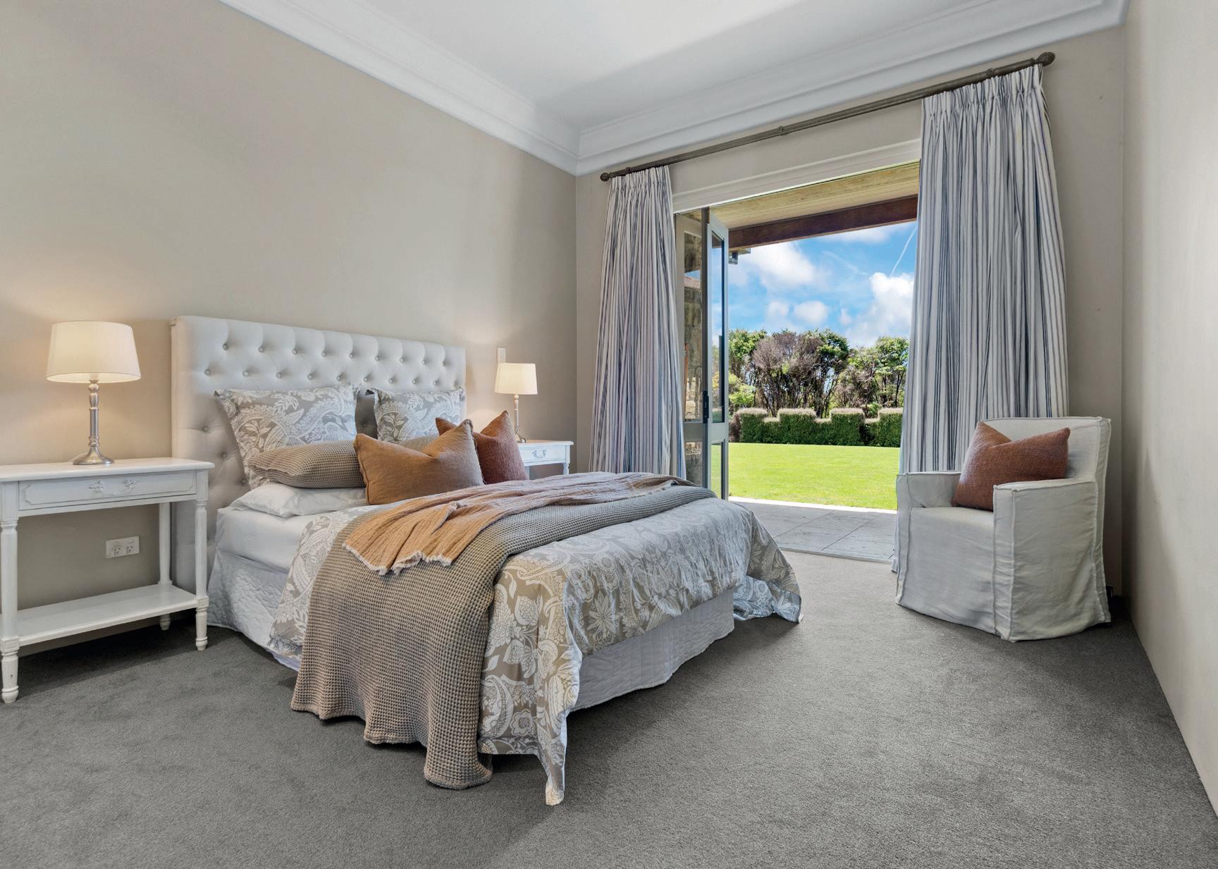 From the grand 627 sq m residence, enjoy sweeping vistas across manicured lawns to the Hauraki Gulf islands, Clevedon Valley, Wairoa River, and nearby polo fields. This is a dream setting for an active family, offering exceptional recreational amenities: an 18 m heated pool, spa pool, a full-size international astro-turf tennis court, and a floating pool pavilion complete with barbecue and fridge for effortless entertaining.