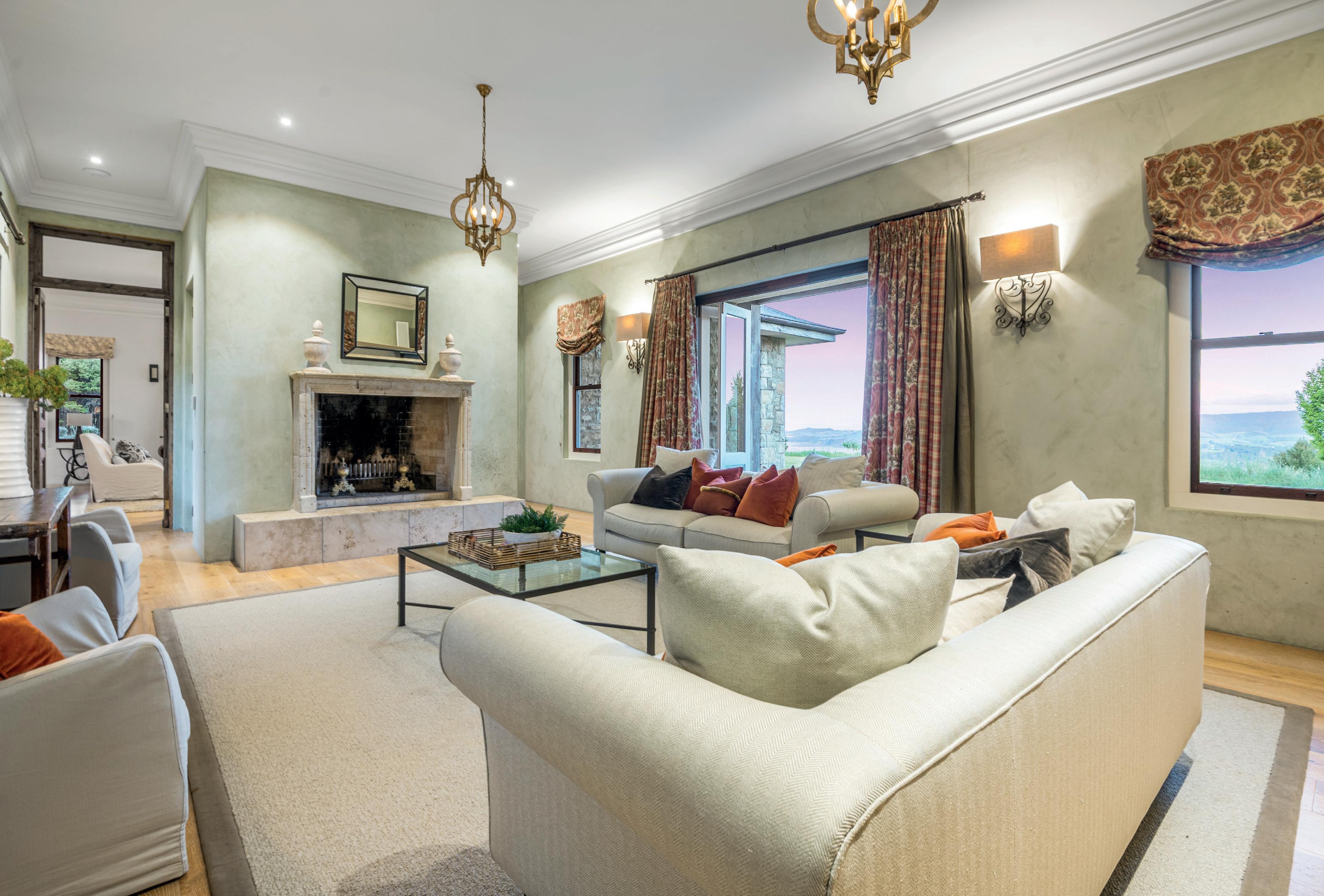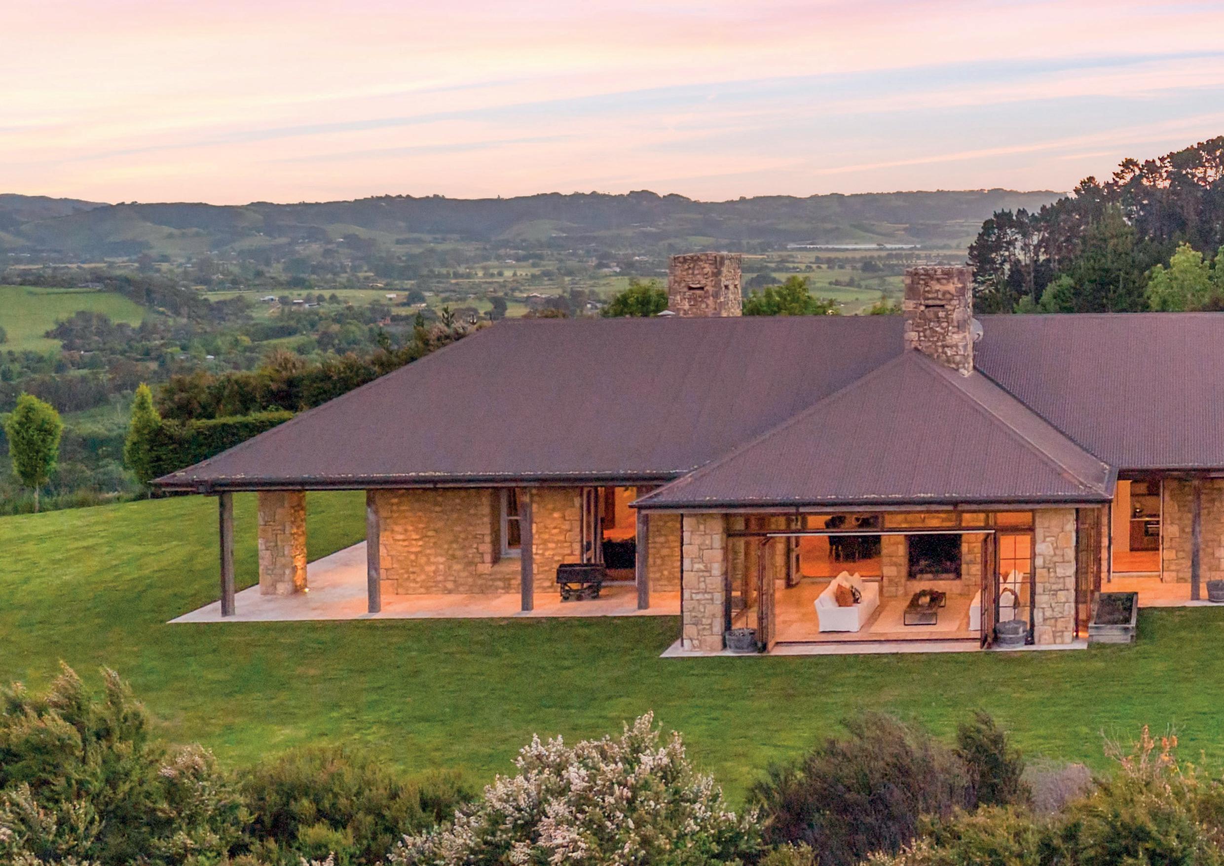 The home itself, crafted from Te Kuiti limestone and framed by gabion walls, exudes relaxed lodge elegance. Inside, soaring 3.6 m studs and natural textures create a warm, inviting atmosphere. Egyptian timber doors open to expansive American oak floors