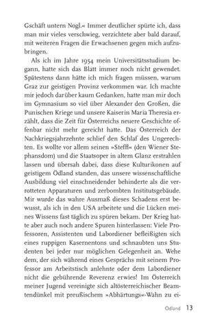 Gschäft untern Nogl.« Immer deutlicher spürte ich, dass man mir vieles verschwieg, verzichtete aber bald darauf, mit weiteren Fragen die Erwachsenen gegen mich aufzubringen. Als ich im Jahre 1954 mein Universitätsstudium begann, hatte sich das Blatt immer noch nicht gewendet. Spätestens dann hätte ich mich fragen müssen, warum Graz zur geistigen Provinz verkommen war. Ich machte mir jedoch darüber kaum Gedanken, hatte man mir doch im Gymnasium so viel über Alexander den Großen, die Punischen Kriege und unsere Kaiserin Maria Theresia erzählt, dass die Zeit für Österreichs neuere Geschichte offenbar nicht mehr gereicht hatte. Das Österreich der Nachkriegsjahrzehnte schlief den Schlaf des Ungerechten. Es wollte vor allem seinen »Steffl« (den Wiener Stephansdom) und die Staatsoper in altem Glanz erstrahlen lassen und übersah dabei, dass diese Kulturikonen auf geistigem Ödland standen, das unsere wissenschaftliche Ausbildung viel einschneidender behinderte als die verrotteten Apparaturen und zerbombten Institutsgebäude. Mir wurde das wahre Ausmaß dieses Schadens erst bewusst, als ich in den USA arbeitete und die Lücken meines Wissens fast täglich zu spüren bekam. Der Krieg hatte aber auch noch andere Spuren hinterlassen: Viele Professoren, Assistenten und Labordiener befleißigten sich eines ruppigen Kasernentons und schnaubten uns Studenten bei jeder nur möglichen Gelegenheit an. Wehe dem, der sich während eines Gesprächs mit seinem Professor am Arbeitstisch anlehnte oder dem Labordiener nicht die gebührende Reverenz erwies! Im Österreich meiner Jugend vereinigte sich altösterreichischer Beamtendünkel mit preußischem »Abhärtungs«-Wahn zu eiÖdland