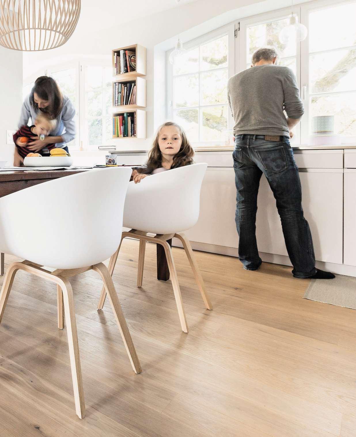 Die beidenliebenden angenehmen skandinavischenEinrichtungsstil: helles Holz,klareFormen, dezenteFarben. Darumentscheidensich diezweibei der Einrichtung fürMaterialien undFarben, diediesemStilentsprechen.Sowie zum Beispiel die14Zentimeter breitenund über 2Meter langenLandhausdielen, die sie im ganzenHaus verlegen liessen–auch in derKüche undden Bädern.Jenach verlegter Laufrichtung sorgen dieHolzdielen füroptisch längereoderbreitereRäume. Es isteineEiche, diemit einemweisspigmentiertenÖlzusätzlich aufgehellt wurde. →