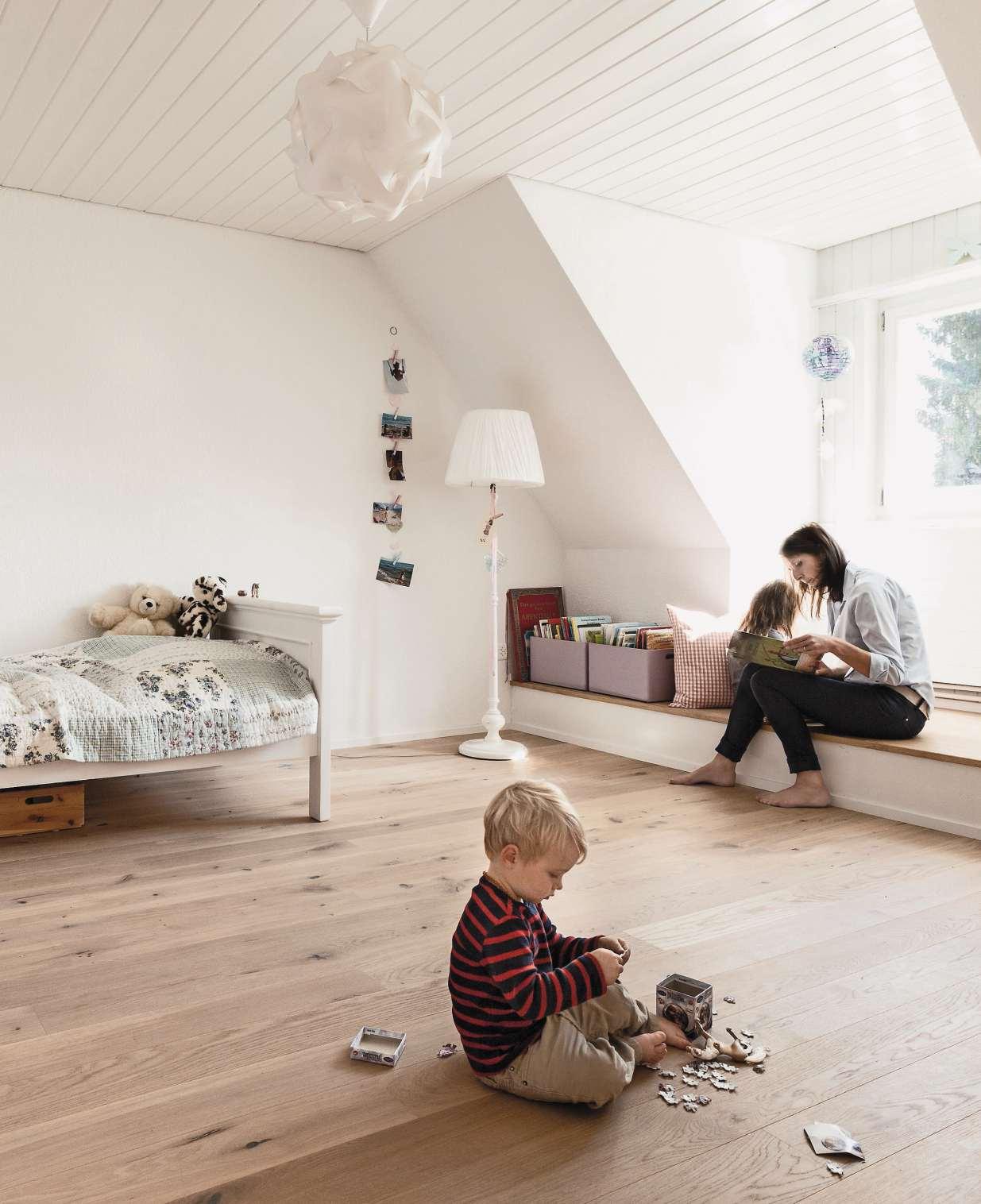 Büroarbeiten gibt es nuneinen kleinen Sekretär im Erkermit Blick aufden Garten Nebendem Schlaf- undBadbereich derEltern placierten sie im erstenStock einzweites WC sowieein kleineresBad fürdie Kinder. Im Treppenhaus wurde eine sperrige Verkleidungaus Holz herausgerissen undimDach einOberlichteingebaut.Tagsüberscheint jetztTageslicht durchdie sechs Glasziegel underhellt den Treppenbereich.Inder Nachtsorgt eine LED-Röhrehinterdem Oberlichtfür Helligkeit. Im zweiten Stockwiederumliessen Claudiaund Michael dieursprüngliche Raumaufteilungbestehen. Die zwei behaglichenZimmerunter denweissgestrichenenDachschrägensinddas Reich von Anika (7) undFrederik(3).
