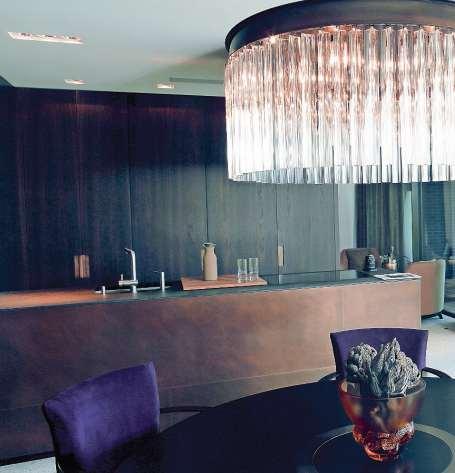 Die Bewohner liessensämtliche Möbel von«TheVendome Group», einerauf individuelle Inneneinrichtungen spezialisierten,international tätigenFirma in Rotkreuz,auf Mass anfertigen.«Beider Einrichtung habenwir unsauf dieneustenTrends gestützt,und da spielt Bronze eindeutigeinewichtige Rolle.» Besonders effektvollwirkt diebronzene Küche, welche derKüchenbauer Rolf Zürchernach denVorstellungendes Paares realisierte;dazupasst derDampfabzugimselben Look.Ausgesuchte Accessoires, Vasenund Schalensindebenfalls in Bronze gehalten