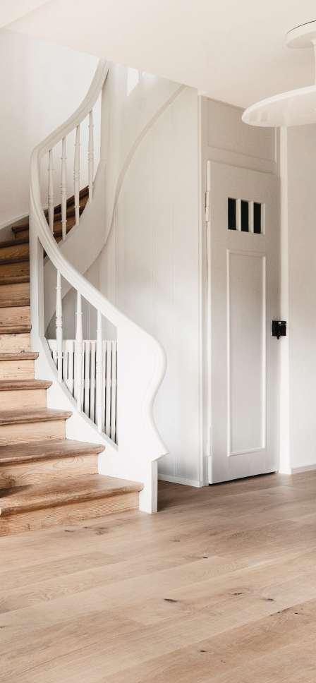 Über drei Stockwerke schlängelt sie sich hoch biszum Estrich.Die Stufen aus Eichen- undTannenholzknarren noch wie vorhundert Jahren.Claudia undMichael liessendie Treppe komplettabschleifen undölen. DasGeländermit denStaketen wurdeineinem hellen Grau gestrichen, so wiealleTüren undTürrahmen undalles andere ursprüngliche Holzwerk im Haus. ZugeklebteAusfachungenanSchrank- und Zimmertürenliessen diebeideninstundenlangerHandarbeit freilegen. Undweil sie möglichst viele deraltenTüren wiederverwendenwollten, passten dieBesitzer denneuenEingangzum Badder bestehendenTüreanund nicht–wie im Normalfall –umgekehrt.
