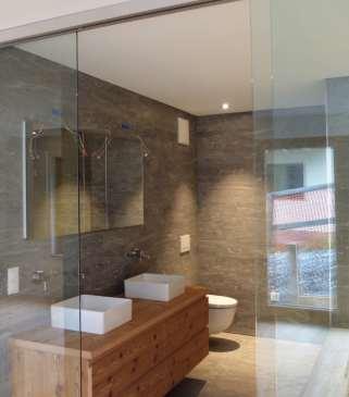 Nichts,was ablenken könnte Über dieMaterialien fürdie Auskleidung des Gebäudes brauchtenMutterund Sohn nichtzudiskutieren.«Wirsindbeidekompromisslos», sagt Hédiguer.«Auch wenn vomBudgether PVCFenster naheliegend gewesenwären,kamen sie füruns nicht infrage.» Anstelle vonKunststoffFenstern kamensolche auseuropäischemEichenholz zumEinsatz. Die Kombinationdes warmen, geöltenHolzes mitkühlem,helllasiertemSichtbeton undGlaszieht sich aussenwie innenkonsequentdurch.Auch die Bödensindeinheitlich:ein geschliffener, anthrazitgeölterUnterlagsboden in sämtlichenRäumen. Die Wände weisen einen hellenSumpfkalkGlattputzauf.Jeneinden beidenNasszellensindschwarz pigmentiert undmachensiesozubehaglichenHöhlen.