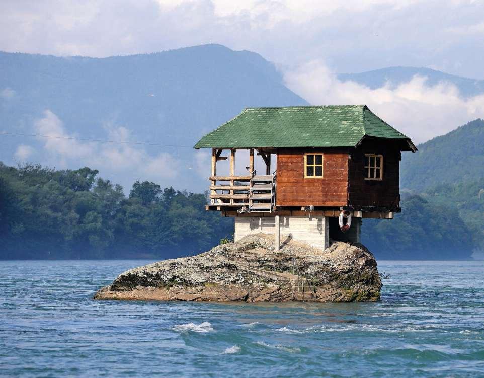 Aufeinem kleinen Fels inmittendes Grenzflusses Drina, derSerbien vonBosnien undHerzegowina trennt,steht dieses kleineHolzhaus. Im Jahr 1968 begannen einige mutige Schwimmermit demBau und brachten über dieJahre immermehrMaterial. DasRefugium, dasallen Kräftender Naturstandhält,scheint in einem ewigen Gleichgewicht zu verharren. Heuteist dasHausein beliebtes Fotosujet fürTouristen,die vondem nahen StädtchenBajinaBašta hierhergelangen.(dst.)