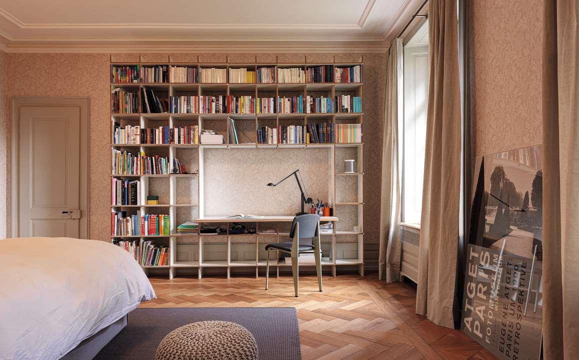 Rechte Seite oben: Geschickt wurde ein kleines Home-Office in die Bücherwand integriert. Rechte Seite unten: Das Bett als grosszügige Rückzugsfläche.