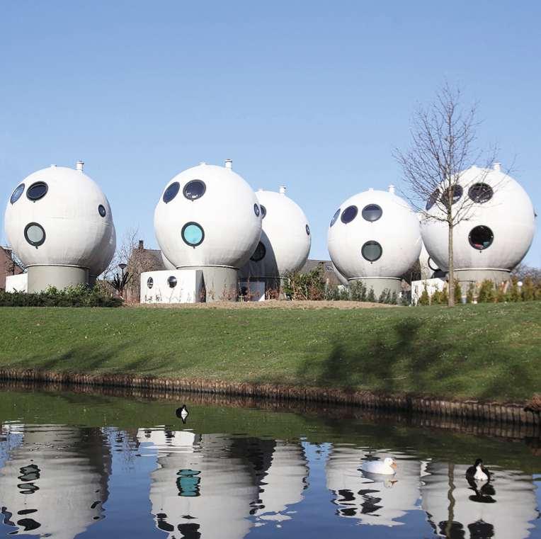Als hätten Ausserirdische ihre Eier an den Kanal gelegt, so sehen die kugelrunden Wohnhäuser aus, die der Architekt Dries Kreijkamp mithilfe der Stadt s-Hertogenbosch und der niederländischen Regierung 1984 realisierte. Mit einem Durchmesser von 5,50 Meter bieten die «Bolwoningen»-Eier auf drei Etagen Platz für zwei Schlafzimmer im ersten Stock, Bad und Küche im 2. Stock und dem Wohnzimmer mit Rundsicht ganz oben. Über die Ästhetik der «Ballwohnungen» lässt sich streiten, beliebt und gesucht sind die Objekte weiterhin. (dst.) denbosch-cultuurstad.nl/Categorie/Bolwoningen