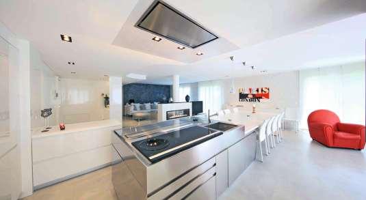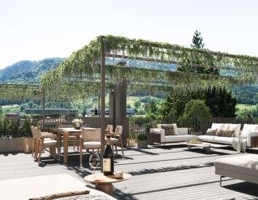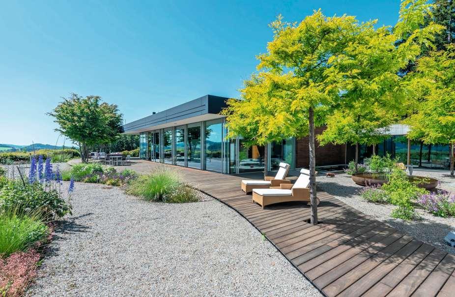 Bei der Einrichtung lässt sich die weitgereisteBauherrschaftvomeigenenSinnfür schlichteWohnlichkeitleiten.HelleNaturfarben dominieren, ausgesuchte Designstücke wie ein fünf Meter langer, stützenfreier Esstisch unterstreichen die Grosszügigkeit der Räume. Auch die moderne Kunst an den Wänden bietet Fokus, ohne theatralischalleAufmerksamkeitaufsichzu ziehen. Die grösste Aufmerksamkeit gebühre dem Garten, findet die Bauherrschaft Der Wunsch nach dem grünen Flecken habe alles ins Rollen gebracht Selten hat ein Gärtner mehr Aufwand betrieben, um sich sein kleines Paradies zu schaffen.