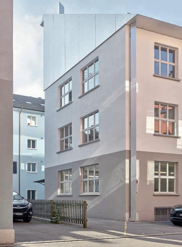 Rechte Seite: Aufgestockt: Das Neubauvolumen differenziert sich mit der Fassade aus Metall vom verputzten Bestand.