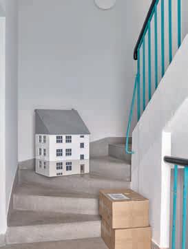 Farbtupfer: Die türkisfarbene Lackierung des Treppengeländers setzt einen Akzent zum grauen Beton –und zum kleinen Modell des Hauses.
