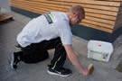 In die ehemalige Velowerkstatt im Erdgeschoss zog das Grafikatelier des Bauherrn ein. Das erste Obergeschoss wird ebenfalls als Atelier genutzt, die bestehende Wohnung im zweiten Obergeschoss wurde um das neu gebaute dritte Obergeschoss erweitert. Hellgraues Linoleum und grau gestrichene Radiatoren bringen optisch Ruhe in