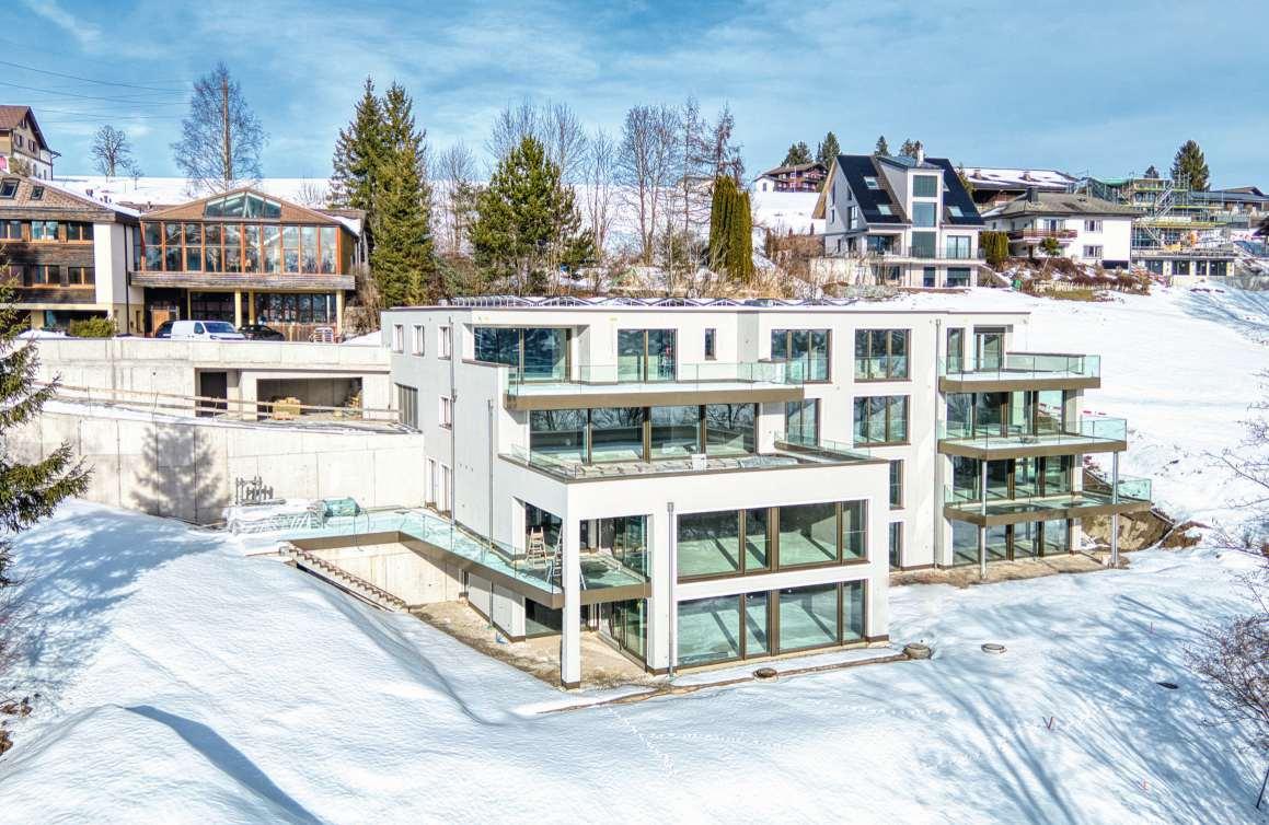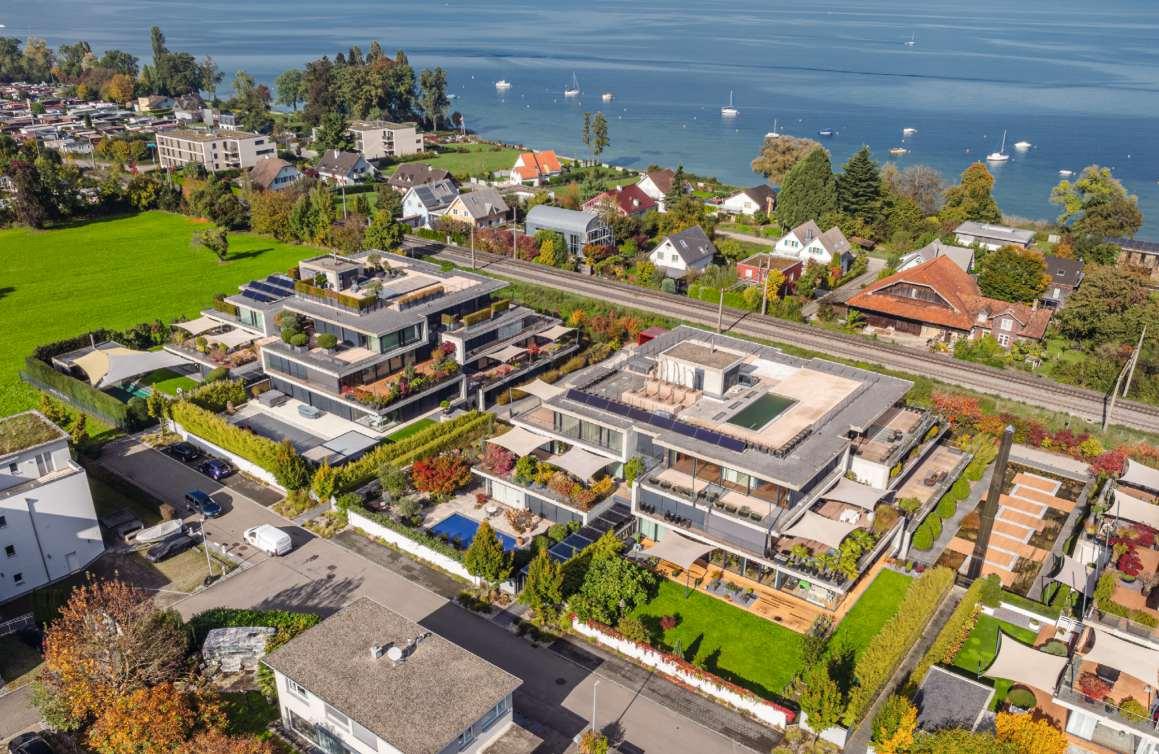 Das fünfgeschossige Haus mit moderner,markanter Architektur undeiner edlen Holzverkleidung aus vorvergrauten Latten fügt sich stilvoll in die Umgebung ein Die vier exklusiven Eigentumswohnungen befinden sich derzeit im hochwertigen Innenausbau und sind im Sommer 2026 bezugsbereit. Grosszügige3½-ZimmerGrundrisse, ein erstklassiger Ausbaustandard und das Minergie Label garantieren nachhaltigen Wohnkomfort. «VillaamWeinberg» steht für höchste Bauqualität, minimalen Energieverbrauch und eine langlebige, wertbeständige Substanz. –Vier stilvolle 3½-Zimmer-Wohnungen mit 105 bis 180m2 Nettowohnfläche –Elegante, 2-stöckige Dachwohnung mit beeindruckender See- und Bergsicht –Loggia, Terrasse oder grosszügiger Garten als Erweiterung des Wohnraums – Ruhige Wohlfühloase mit malerischer Seesicht