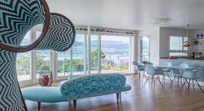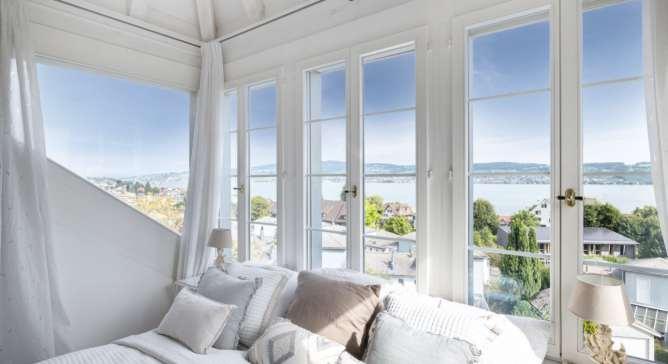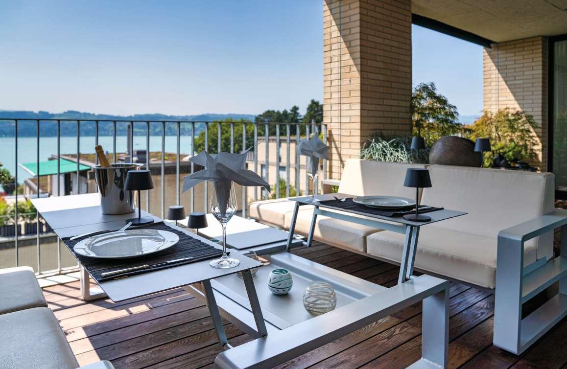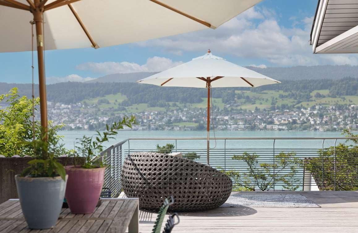 Die Glasbalkone verschwinden in der optischen Wahrnehmung und lassen den Blick zum See uneingeschränkt wirken.