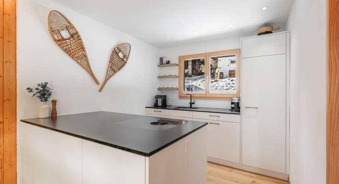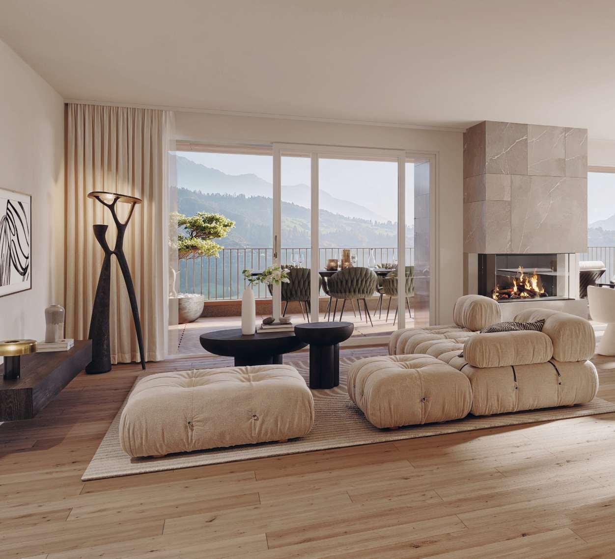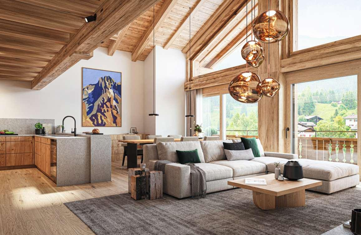 Rund 250 Quadratmeter Wohnfläche, grosszügige Raumhöhen und bodentiefe Fenster sorgen für lichtdurchflutete Eleganz und bieten einen freien Blick auf die Bergwelt. Der direkte Liftzugang, eine Galerie und der Wellness- und Fitnessbereich im Neubau mit sieben Wohneinheiten verbinden erstklassigen Komfort, Ruhe und alpine Lebensqualität.