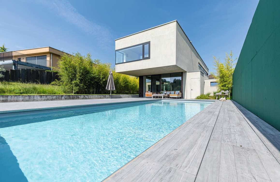 Dieses moderne Einfamilienhaus nahe Aarau liegt in einer ruhigen, familienfreundlichen Nachbarschaft und bietet einen unverbaubaren Blick ins Grüne. Der gepflegte Garten mit Pool und überdachtem Sitzplatz lädt zum Entspannen ein. Dank der Nähe zu Aarau ist die Infrastruktur hervorragend, mit Einkaufsmöglichkeiten, Schulen und ÖV in kurzer Distanz.Das 2008 erbaute Haus besticht durchzeitlose Architektur und hochwertigen Innenausbau. Auf drei Etagen verteilen sich 255 m² Wohnfläche mit 9½ Zimmern,darunter fünf Schlafzimmer und drei Bäder.Ein separates Zimmer imErdgeschoss eignet sichideal als Bürooder Praxis.Zusätzlich bietet das Untergeschoss Gäste- und Hobbyraum sowie einen Hauswirtschaftsraum. Eine Doppelgarage und drei Aussenstellplätze runden das Angebot ab.