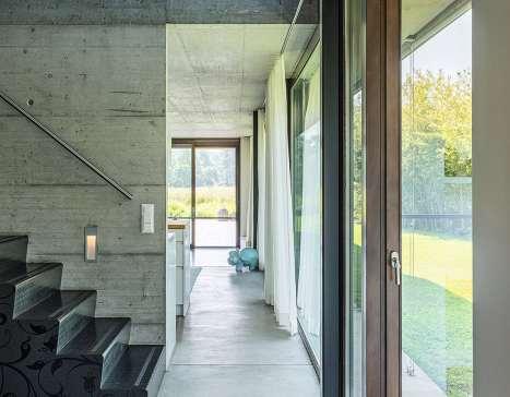 Die gewähltenFarben undMaterialien manifestieren den edlen Charakterdes Hauses. Heller Sandstein prägt sowohl die Aussenfassade als auch die Bodenbeläge im Innenbereich und schafft eine zeitlose Basis mit hoher Flexibilität für individuelle Gestaltung und Einrichtung.