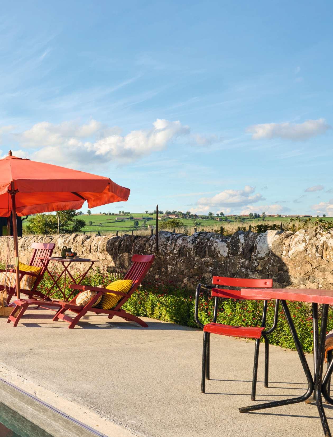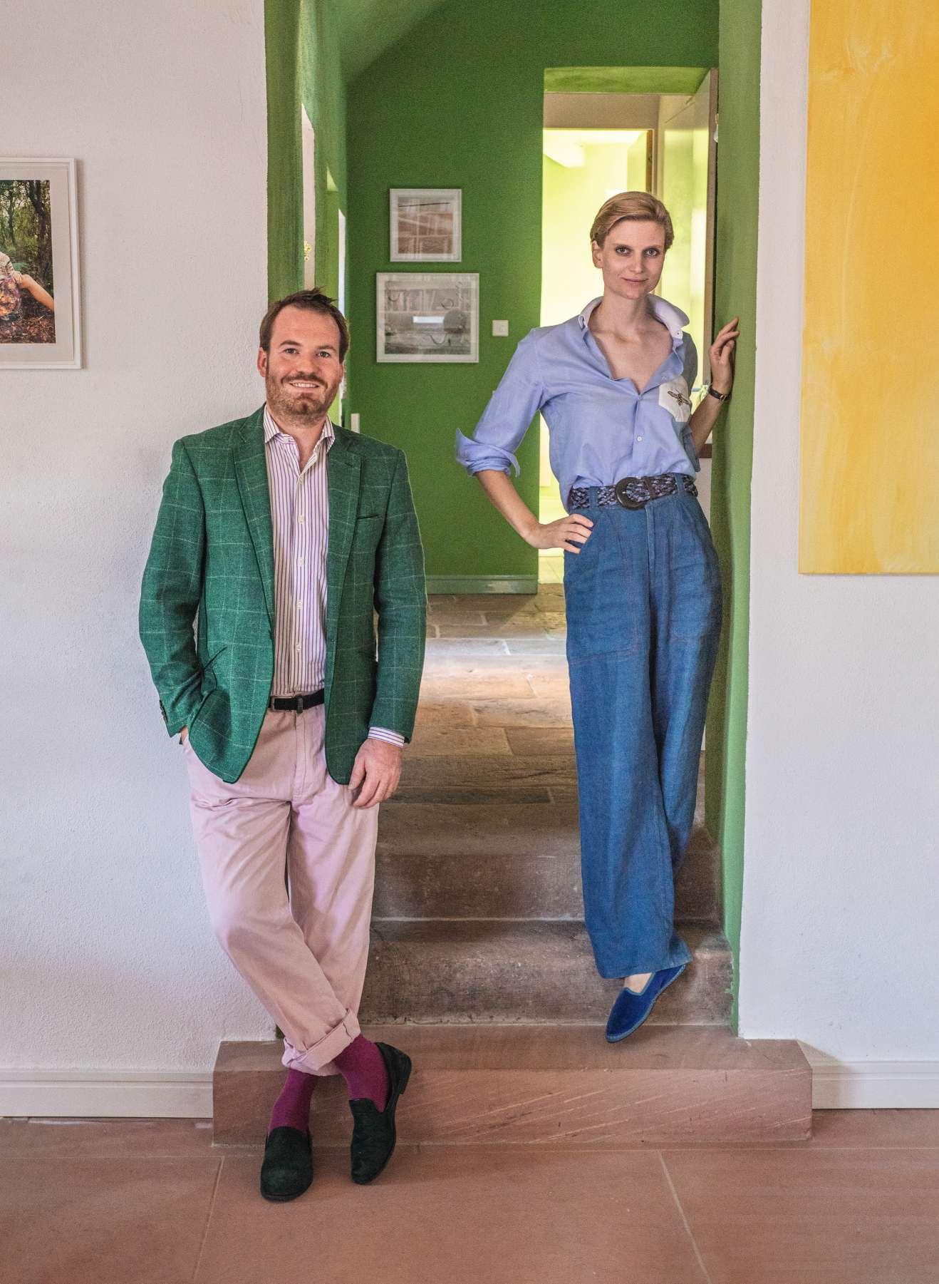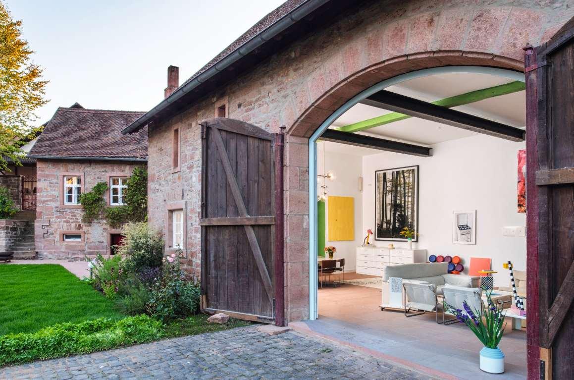 Starke Farben bilden die Bühne für Kunst und Memphis-Design in den renovierten Stallungen eines mittelalterlichen Schlosses