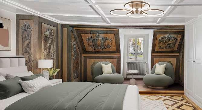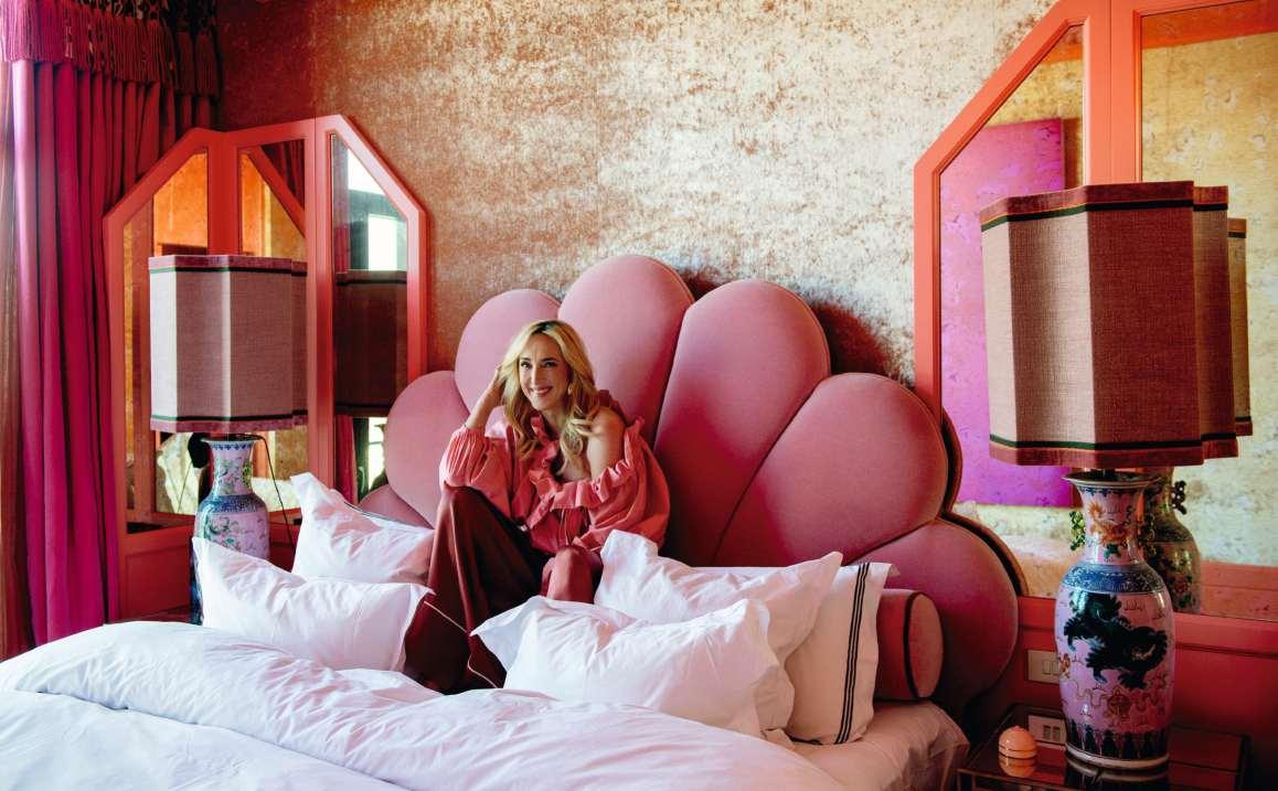 In den Privatgemächern schaffen umhüllende Pinktöne Wärme und Weichheit. Dazu: Art-déco-Elemente, Broadway-Spiegel und antike Leuchten. Hellrosa Marmor im Bad und von Buntglas inspirierte Trompe-l’œil-Vorhänge verleihen dem Raum eine poetische, theatralische Note, zwei antike Pantherskulpturen bewachen