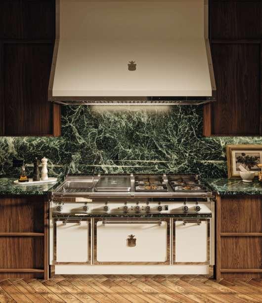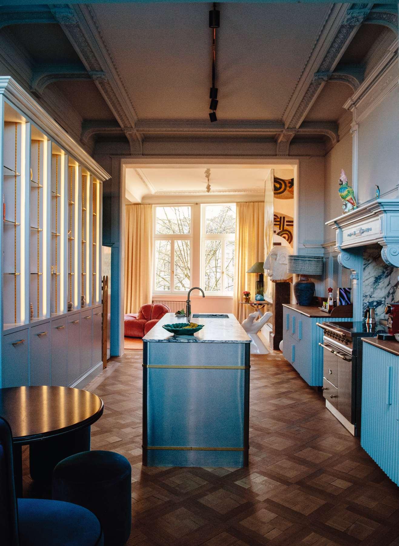 Onseas Lieblingsraum: Die offene Küche, eine Oase mit blaugrünen Schränken und edlen Marmoroberflächen.