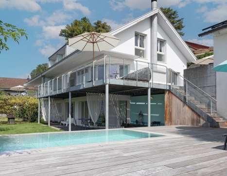 Herrlibergzählt zu den bevorzugten Gemeinden am rechten Zürichseeufer und überzeugt durch hohe Lebensqualität, ruhige Wohnlagen und einen attraktiven Steuerfuss.Inerhöhter,sonniger Hanglage befindet sich dieses stilvolle 6½-Zimmer-Doppeleinfamilienhaus,das rund 210 m² Wohnfläche über drei Etagen bietet. Grosse Fensterfronten,helle Materialien und ein durchdachtes Raumkonzept prägen die grosszügige Atmosphäre. Ein separater Wohnbereich im Untergeschoss eröffnet zusätzliche Nutzungsmöglichkeiten. Der mediterran gestaltete Garten mitsonniger Terrasse, Salzwasser-Infinity-Pool (2022) und separatem Pool- und Gästehaus bildet das eindrucksvolle Herzstück dieser besonderenLiegenschaft.