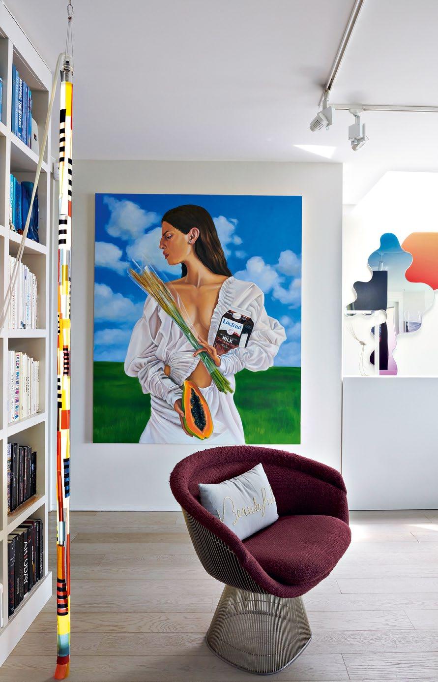 Sur le mur: tableau de Chloe Wise, «Gluten Freedom» (2017); accompagné d’un néon de Tobias Rehberger, «Infection 5Y3F» (2008); chaise Knoll Collection de Warren Platner (1966).