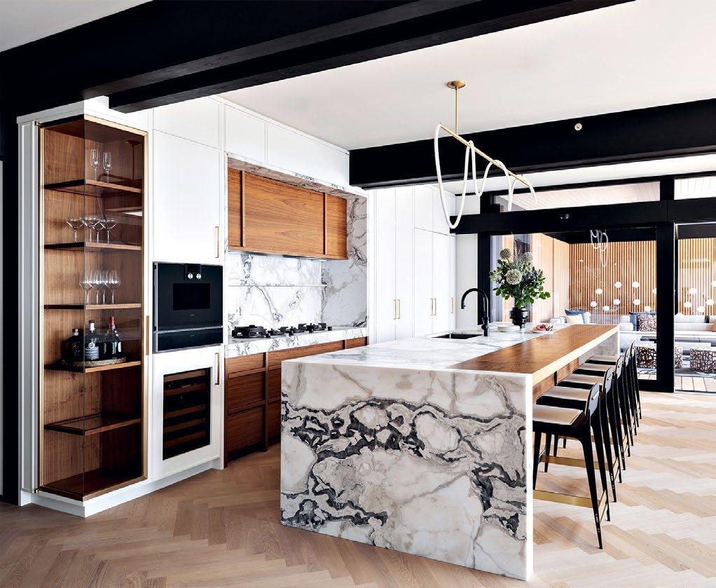 tacle changeant au gré des heures, tandis que des portes coulissantes, parfaitement intégrées, abolissent toute rupture visuelle et permettent une circulation fluide.