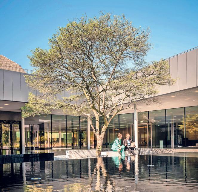 Le nouveau campus EHL de Lausanne a été délibérément construit avec le moins de murs possible dans l’idée de promou voir l’ouverture d’esprit parmi la commu nauté. Ce joyau d’architecture durable a pour ambition de créer un village à part entière, ouvert sur l’environnement verdoyant des hauteurs de Lausanne et la communauté locale. Le campus favorise les interactions entre les étudiant·es, les enseignants ainsi que les nombreux professionnels qui visitent l’EHL. Il offre un cadre exceptionnel dans lequel il fait bon étudier, travailler et vivre. En effet: les grands espaces, y compris à l’extérieur, favorisent le dialogue, l’organisation d’événements et les nombreux travaux de groupe qui font partie intégrante des programmes de l’EHL. Il en va de même pour l’espace d’accueil central (photo), dont la réception se trouve juste en face de la nouvelle entrée principale, située sur la route de Berne.