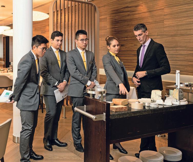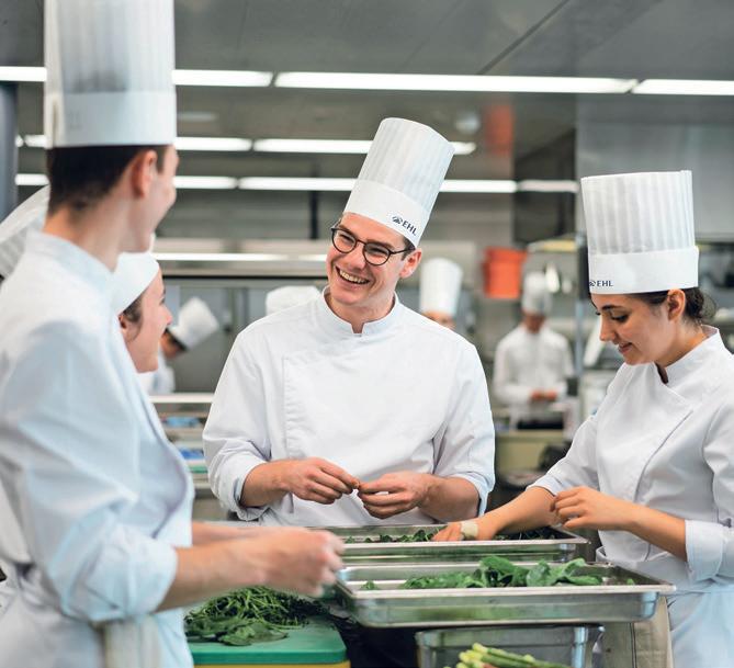 L’enseignement à l’EHL sort quelque peu de l’ordinaire. En effet, les étudiant·es d’Année Préparatoire étudient aussi bien dans des salles de classe «tradition nelles» que dans les 12 différents points de restauration du campus, les cuisines d’application (photo) mais aussi à la réception, aux bars ou encore au service hébergement. Dès le début de leur formation bachelor, les étudiant·es développent des connaissances pratiques qui leur permettront ensuite de suivre leurs cours de management et d’avoir une bonne vue d’ensemble sur la palette des métiers de l’accueil. Et si l’EHL ne forme pas ses étudiant·es à devenir chef, ni sommelier, ni réception niste, ces derniers découvrent ces métiers aux côtés de brillants profes sionnels, dont six Meilleurs ouvriers de France ou encore le Meilleur sommelier d’Italie.