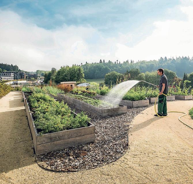 En accord avec les ambitions de responsabilité sociétale de l’EHL, le nouveau campus encourage un mode de vie durable et offre un véritable écosystème naturel. Grâce au jardin pédagogique biologique, la commu nauté de l’EHL est sensibilisée à l’écologie et à une forme d’agriculture durable. La surface de 2500 mètres carrés permet aux étudiant·es d’appré hender la notion de saisonnalité et de comprendre l’importance des circuits courts, «de la fourche à la fourchette». Environ 300 arbres et 5500 arbustes d’espèces locales, ainsi que 400 pieds de vigne composent le paysage verdoyant du nouveau campus. Environ 250 000 abeilles provenant de six ruches vivent et butinent chaque jour sur le site.