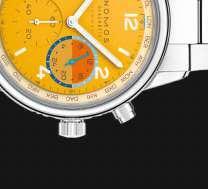 Auch bei Nomos sind Farben Trumpf Nachdem letztes Jahr das Modell Tangente mit einer ganzen Palette bunter Zifferblätter aufwartete, ist es dieses Jahr die Linie Club Sport Neomatic in einer auch technisch neuen Variante mit Zeitzonenfunktion. Die in den Farbtönen von sechs verschiedenen Landschaften der Welt gehaltenen Zifferblätter zeigen aus der Mitte die Ortszeit der am äusseren drehbaren Reif gewählten Zeitzone während das kleine Hilfszifferblatt bei drei Uhr die Heimatzeit im 24-Stunden-Format anzeigt. Per Druck auf den Knopf bei zwei Uhr lässt sich so in Stundenschritten virtuell um die Erde jetten, ohne die Zeit zu Hause aus den Augen zu verlieren. Bei einem Druck auf den Knopf rückt der Reif mit den 24 Weltstädten um eine Position ostwärts und nimmt dabei den Stundenzeiger um eine Stunde mit. Das Automatikwerk mit Zeitzonenmodul DUW 3202 ist nur 4,8 mm hoch und macht die Uhr mit 9,9 mm zur schlanksten Weltzeituhr auf dem Markt.