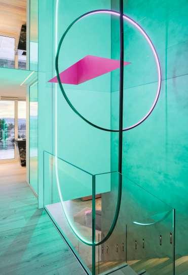 Kommtherein!»ChloëundTillöffnen uns die Tür ihres Hauses, in demsiemitihrenKindernwohnen und ihre Ateliers haben Hier entstehen die Bilder der beiden, ausdrucksstarke, farbenfrohe Werke, die sie in GalerienundanEinzel-undGruppenausstellungen in der Schweiz und im Ausland zeigen. TillRabusstammtauseinerbekannten Künstlerfamilie. Mithilfe der Eltern konnten er und sein Bruder das Gebäudeaus den 1930er Jahren kaufen, das einst als Fabrik für mikromechanische Teile genutzt worden war «Wir wollten diesen besonderen Ort unbedingt vor dem Abriss bewahren», sagt Till. Sein Bruder fand später etwas Eigenes und zog mit seiner Familie aus. Chloë, die am Genfersee aufgewachsen ist, stiess später hinzu und machte die heutige Patchworkfamilie komplett