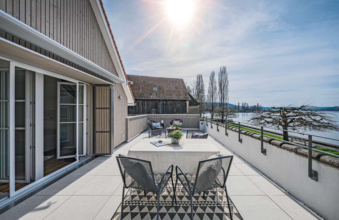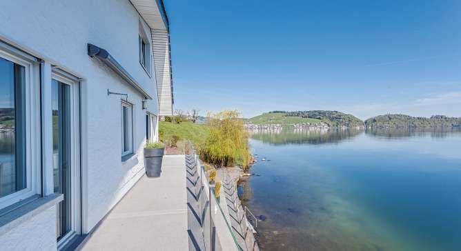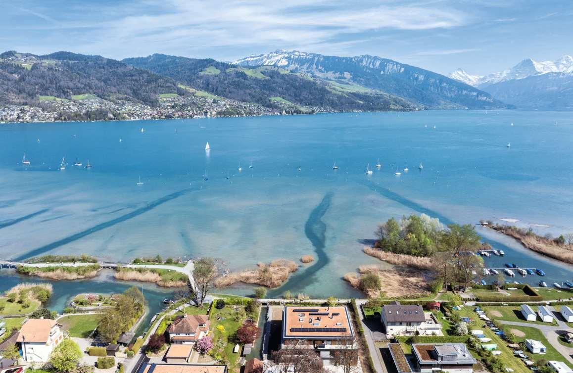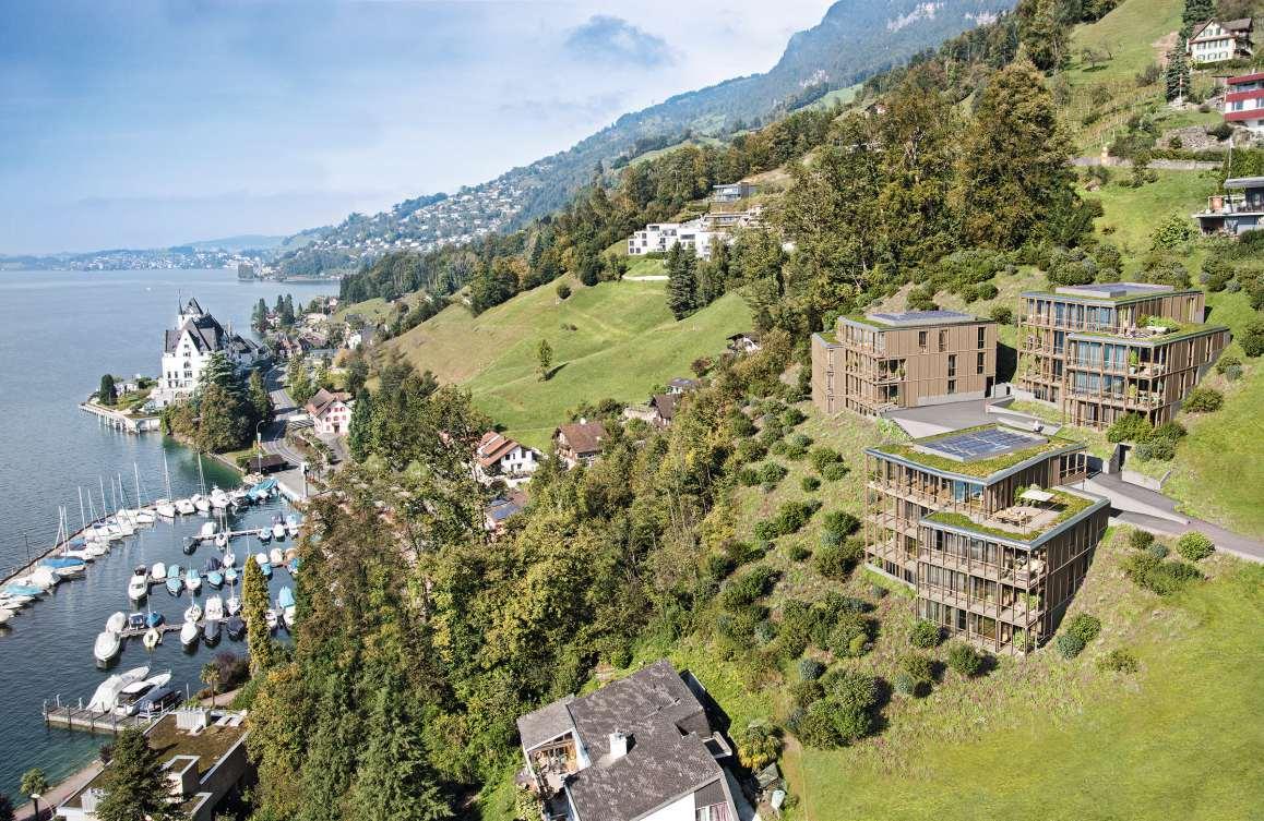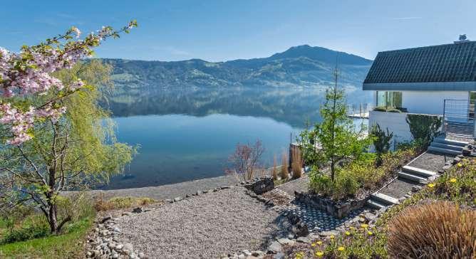 Modern und schnörkellos nimmt sich die Residenz zurück und überlässt die Bühne dem See und der umgebenden Landschaft. Herrliche Ausblicke auf den See und die Berge bieten alle Wohnungen, wobei im ersten Obergeschoss neben den Balkonen auch noch seitliche Aussensitzplätze punkten, während im Erdgeschoss grosse Gärten und gedeckte, nicht einsehbare Terrassen zum Relaxen einladen. Die Attikawohnungen bieten von ihren teils gedeckten Terrassen den schönsten Rundblick.