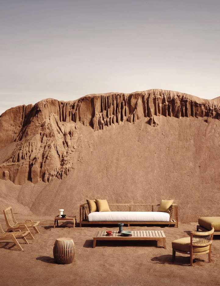 «Synthesis» heisst diese ikonische Kollektion der Outdoor-Möbelmarke Unopiù aus Italien. Für die aktuelle Saison wurde sie mit neuen Stoffen in ockergelbem, indigoblauem und rotem Bouclé in der felsigen Mondlandschaft von Arizona inszeniert Das modulare Sitzsystem aus Teakholz und wetterfestem «WaProLace»-Geflecht umfasst alles, was man für die komfortable Lounge-Ecke braucht: Sessel, Sofas und Couchtische. Dazu gibt es Sonnenliegen und ein Himmelbett.