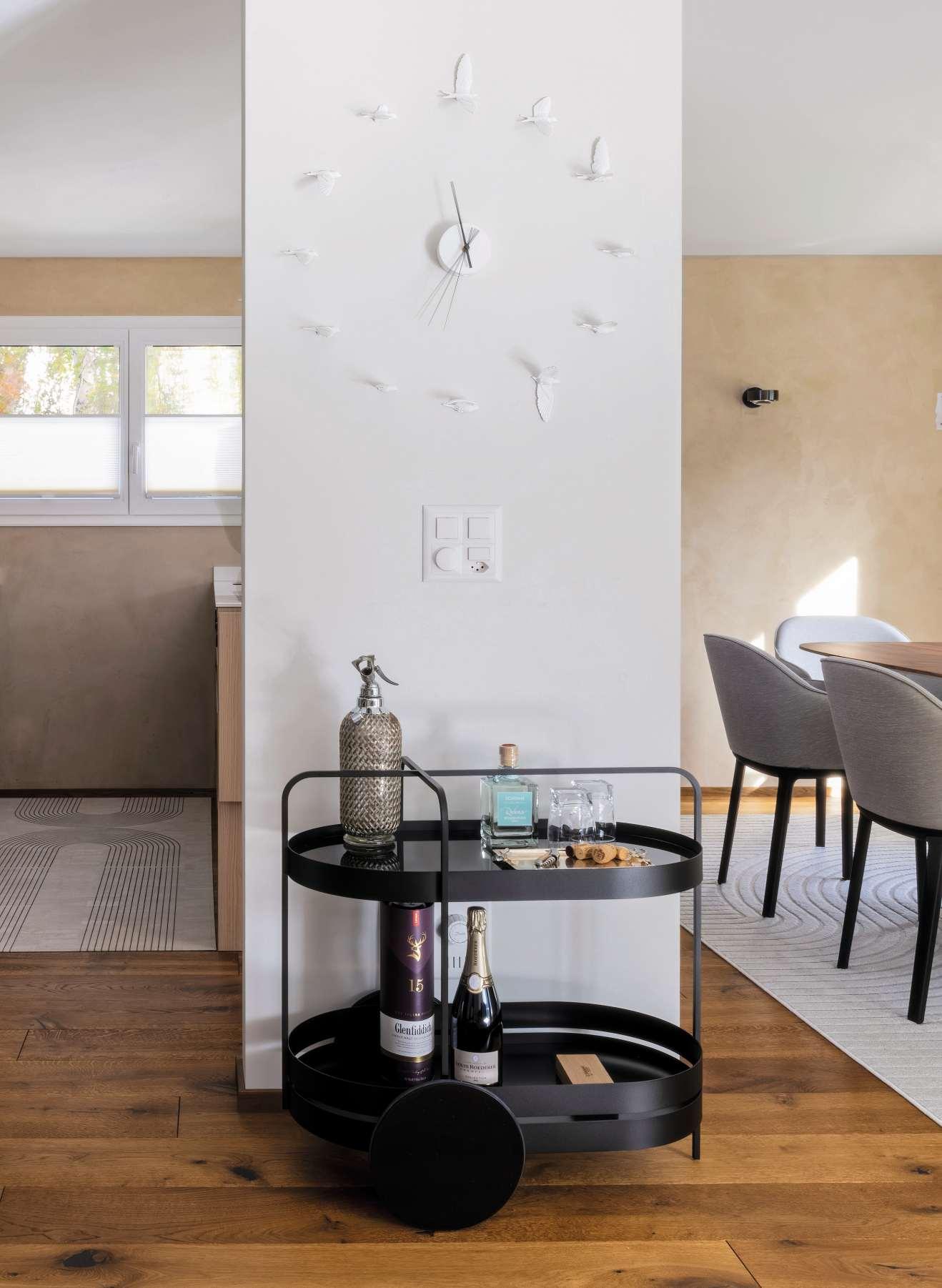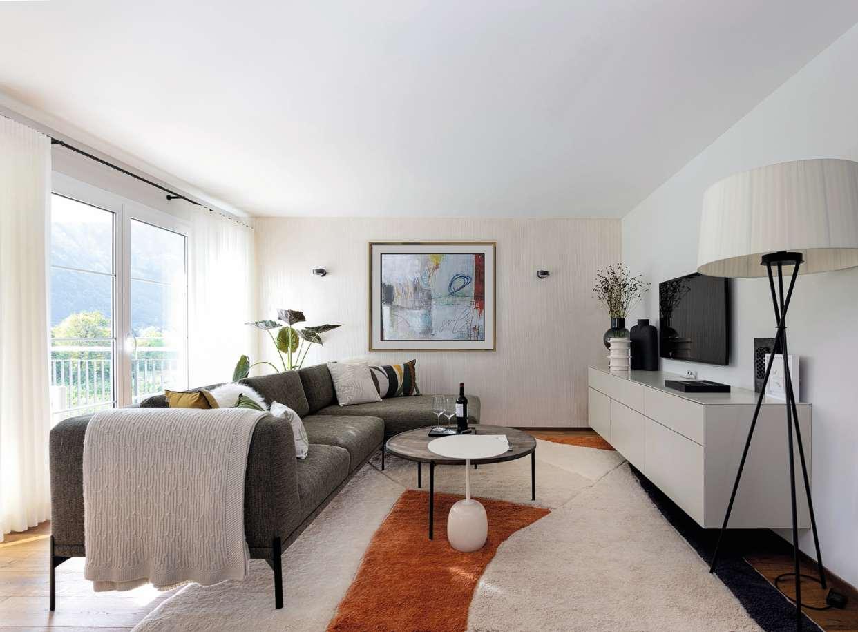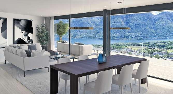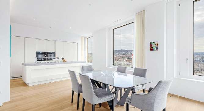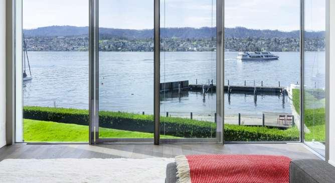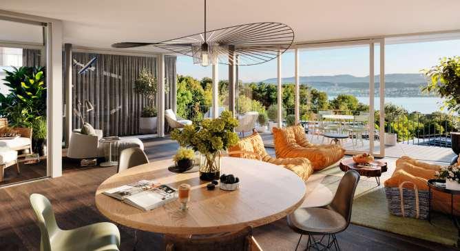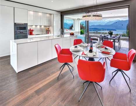 Die klare und reduzierte Formensprache der Architektur und der eingesetzten hochwertigen Materialien findet einen warmen Kontrapunkt im strahlenden Blau des Sees und dem leuchtenden Grün der üppigen Bepflanzung auf den beiden Terrassen. Mit fröhlichen Farben gewählte Dekoration und die Verwendung von Holz-Schiebetüren mit passender Verkleidung in der Küche tragen dazu bei, dass auch im Innenraum der Wohnung eine gemütliche Atmosphäre entsteht.