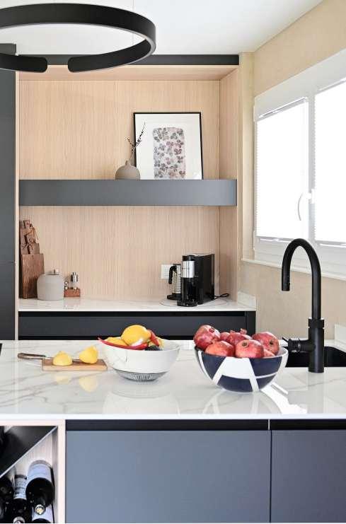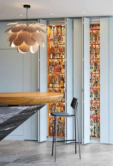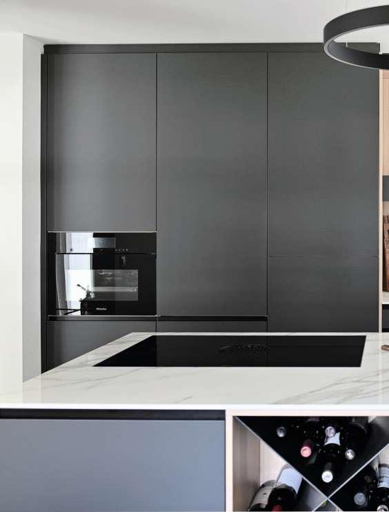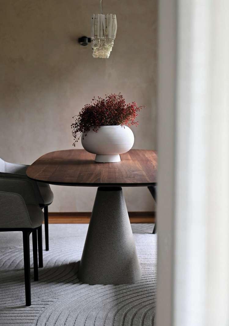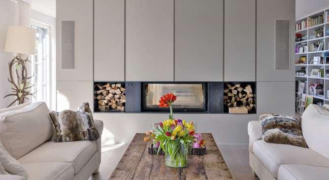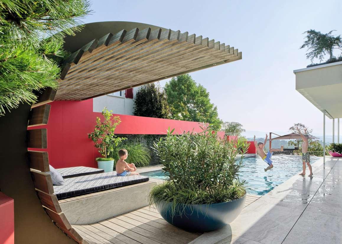 Die klare und reduzierte Formensprache der Architektur und der eingesetzten hochwertigen Materialien findet einen warmen Kontrapunkt im strahlenden Blau des Sees und dem leuchtenden Grün der üppigen Bepflanzung auf den beiden Terrassen. Mit fröhlichen Farben gewählte Dekoration und die Verwendung von Holz-Schiebetüren mit passender Verkleidung in der Küche tragen dazu bei, dass auch im Innenraum der Wohnung eine gemütliche Atmosphäre entsteht.