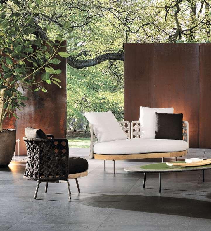 Vor vier Jahren wurde die Linie «Torii Nest» von Oki Satos Architektur- und Designstudio Nendo für den Innenbereich lanciert Nun gibt es sie neu auch als komplette Sitzmöbelfamilie für draussen Angelehnt an traditionelle japanische Konstruktionsweisen spielen die Designs mit nestartigen, scheinbar einfachen Formen und einer optischen Leichtigkeit. Die Rückenlehnen aus geflochtenem Seil erinnern an eine grobmaschige Version von Wiener Geflecht Es gibt ein Zweisitzer-Sofa mit geschwungener Silhouette, fixe wie auch drehbare Sessel sowie eine runde Chaiselongue Schlanke bronzefarbene Aluminiumfüsse unterstützen die luftige Ästhetik, während eine dicke Polsterung auf massivem Teakholzrahmen für den Komfort sorgt.