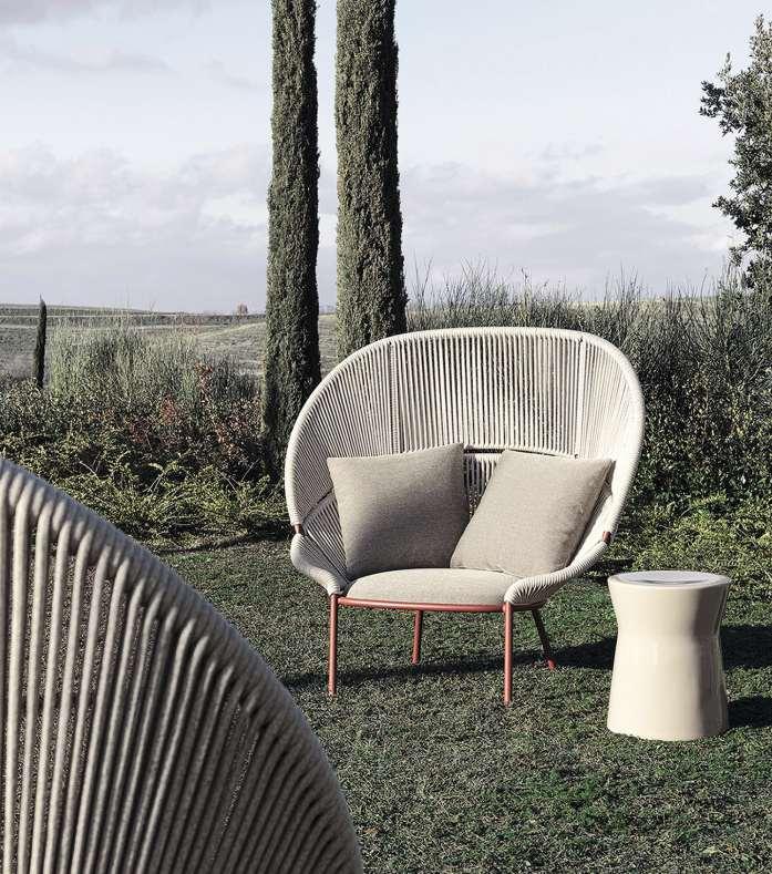 Mit dem Sessel «Petalo» erweitert der belgische Architekt und Designer Vincent Van Duysen die Outdoor-Linie «Timeout» von Molteni&C Sanfte Kurven umhüllen die gemütliche Polsterecke mit kunstvoll geflochtener Rückenlehne Die Seile aus Polypropylen werden üblicherweise in der Schifffahrt verwendet: Sie sind farbecht und widerstandsfähig gegen Wasser und halten schwierigen klimatischen Bedingungen stand. Das Gestell aus leichtem Aluminium kontrastiert in sattem Merlotrot zum écrufarbenen Geflecht Die Rückenlehne gibt es in zwei Höhen für verschiedene Komfortstufen Sie sorgen so für Abwechslung in einer Sitzgruppe