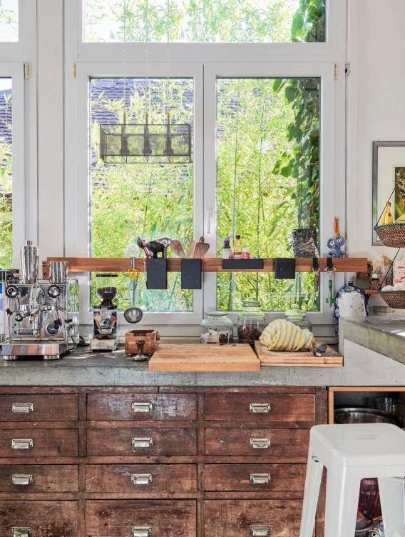 Nach dem Kauf des Hauses vor bald 25 Jahren ergab sich Gelegenheit, die Anordnung der Räume neu zu denken: Der WohnbereichbefindetsichseitheraufderSüd-,das helle, funktionale Atelier auf der Nordseite des Gebäudes Mit der Geschichte und dem industriellenUrsprungdesHausesgingman