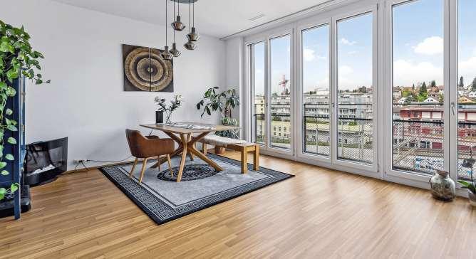 Die Attikawohnung mit 5½ Zimmern hat einen atemberaubenden, unverbaubaren Weitblick. Als Duplex konzipiert, befindet sich in der unteren Etage der grosszügige Wohnbereich und oben der Schlafbereich. Die untere Etage ist komplett von der Terrasse umgeben, von dieser ist auch der Garten über eine Treppe erreichbar Oben hat es 2 weitere Terrassen. Es gibt 2 Bäder und einen grossen Raum für die Waschmaschine. Die Wärmepumpe / Erdwärme befindet sich im Kellerraum (Technikraum). In dieser Ebene sind auch die beiden Stellplätze.