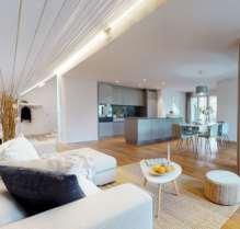 Auf zwei Wohnetagen entfaltet sich ein luftiges Wohngefühl: Oben lädt der loftartige Wohn- und Essbereich mit über 115 Quadratmetern, stylischem Cheminée und gedeckter Terrasse zum Geniessen ein. Die untere Etage mutet an wie eine Hotellobby, von der aus die vier Zimmer, jedes mit Ensuite-Bad, zugänglich sind. Ergänzt wird diese exklusive Wohnung durch einen 50 Quadratmeter grossen Wellnessbereich mit Sauna und Whirlpool und eine private Garage für vier Autos.
