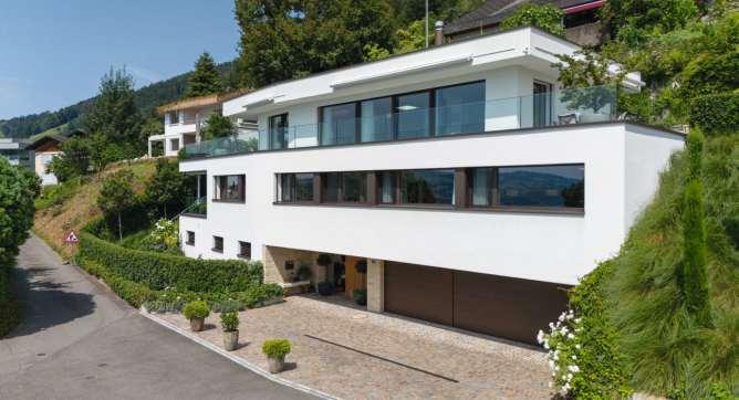 Diese exklusive, neuwertige Villa, Baujahr 2020, mit unverbaubarer Panoramasicht beeindruckt durch aussergewöhnliche Architektur und erstklassige Ausstattung. Drei Wohnebenen mit einer Gesamtfläche von ca. 320 m² sind mit einem Lift erschlossen. Vier Schlafzimmer je mit En-suite-Bad und der offene Attika-Wohn-/Essbereich mit Panoramafenstern bieten luxuriöse Wohnqualität für gehobene Ansprüche. Zwei grosszügige Terrassen mit atemberaubender Weitsicht sind ein besonderes Highlight.