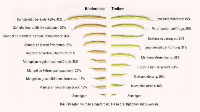 42 Prozentder Teilnehmenden unsererUmfrage nennen die komplexen Lieferketteninder Lebensmittelbrancheals Hauptproblem.Diesemachenes oft schwierig, Massnahmen zu planen und umzusetzen. Eine weitere Herausforderung ist, dass Nachhaltigkeitoftmals hohe Investitionen erfordert (36 Prozent). Schliesslichfehlt es teilweise an einemgemeinsamen Verständnisvon Nachhaltigkeit.