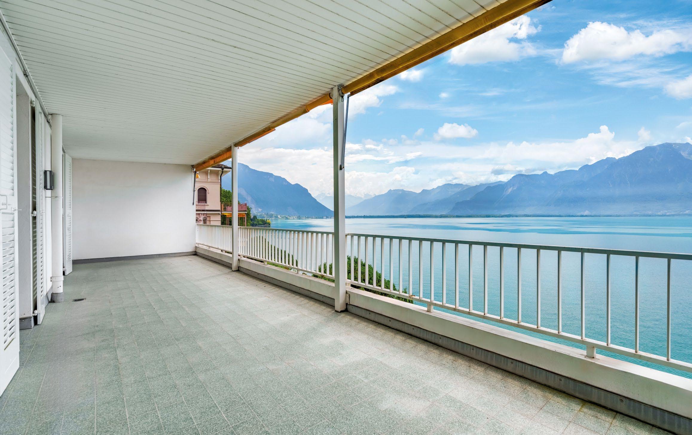 Bel appartement au dernier étage, surface d’env. 150 m2, avec cheminée et balcon d’env 24 m2 Vue sur les Alpes et échappées sur le lac Cave et galetas 2 places int en sus Travaux de rafraichissement à prévoir